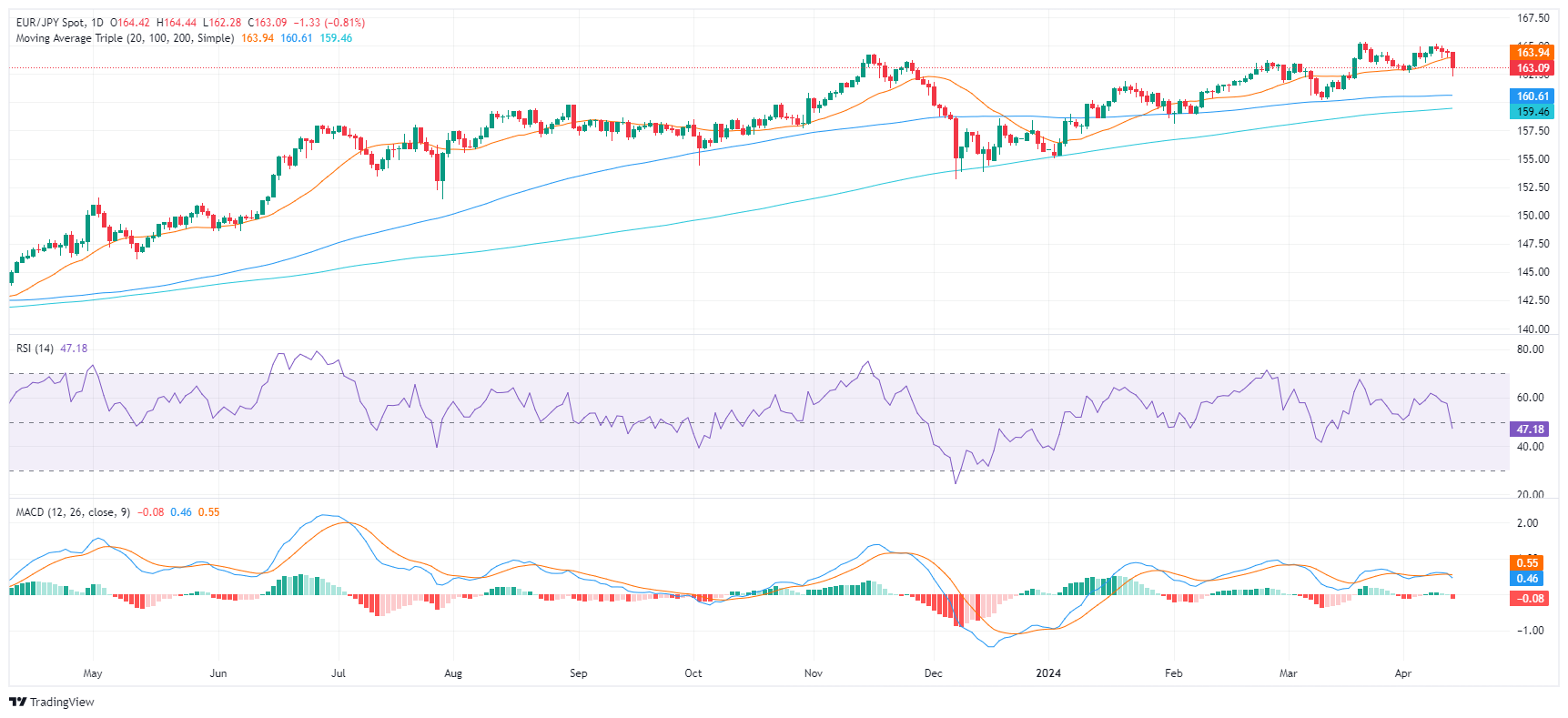 คู่ EUR/JPY ตกลงที่ระดับ ราคา 163.00 ซึ่งแสดงถึงการเปลี่ยนแปลงที่น่าสังเกตซึ่งสนับสนุนผู้ขาย แม้ว่าทั้งคู่จะอยู่เหนือค่าเฉลี่ยเคลื่อนที่อย่างง่าย (SMA) ระยะยาวที่สำคัญ ซึ่งบ่งบอกถึงความโน้มภาวะกระทิงที่อาจเกิดขึ้นได้ แต่ตัวชี้วัดล่าสุดแนะนำให้มีการเปลี่ยนแปลงในระยะสั้น