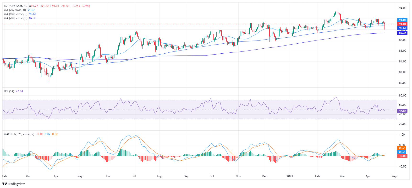 กราฟรายวันของ NZD/JPY บ่งชี้ถึงโมเมนตัมที่อ่อนตัวลง โดย RSI และ MACD แสดงถึงแรงขายที่เพิ่มขึ้น
