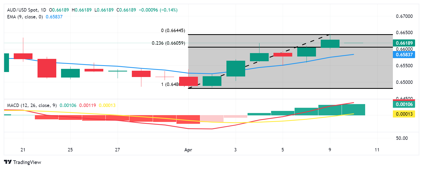 คู่ AUD/USD ซื้อขายประมาณ 0.6620 ในวันพุธ การวิเคราะห์ทางเทคนิคชี้ให้เห็นถึงความเชื่อมั่นขาขึ้นทั้งคู่อาจเห็นกําไรมากขึ้นเนื่องจาก Moving Average Convergence Divergence (MACD) อยู่ในตําแหน่งเหนือเส้นกึ่งกลางและแสดงความแตกต่างเหนือเส้นสัญญาณ แนวต้านหลักอยู่ที่ระดับหลักที่ ราคา 0.6650 ตามด้วยระดับสูงสุดของเดือนมีนาคมที่ ราคา 0.6667 แนวรับหลักอยู่ที่ระดับ Fibonacci retracement 23.6% ที่ ราคา 0.6605 และระดับจิตวิทยาที่ ราคา 0.6600 แนวรับเพิ่มเติมอยู่ที่ค่าเฉลี่ยเคลื่อนที่แบบเอ็กซ์โพเนนเชียล (EMA) 9 วันที่ ราคา 0.6584 และระดับแนวรับหลักที่ ราคา 0.6550