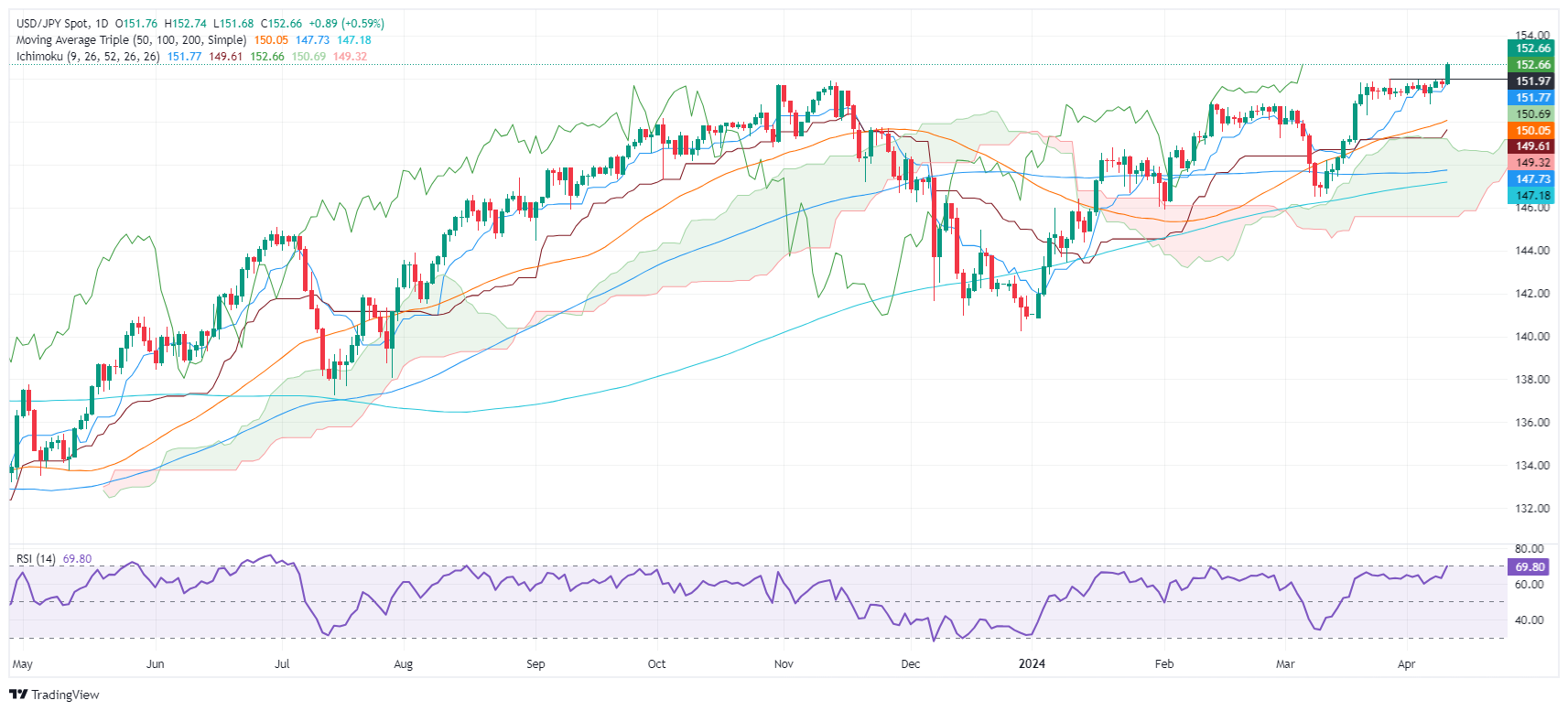 จากมุมมองทางเทคนิค คู่ USD/JPY มีการซื้อขายที่ระดับที่เห็นในปี 1990 จุดสูงสุดสูงสุดในเดือนมิถุนายน 1990 ที่ ราคา 155.78 ตามด้วยระดับสูงสุดของปี 1990 ที่ ราคา 160.32 แนวรับแรกจะเป็นแนวรับระดับจิตวิทยา ที่ราคา 152.00 ตามด้วย Tenkan-Sen ที่ ราคา 151.77 และระดับต่ำสุดของวันที่ 5 เมษายนที่ ราคา 150.81